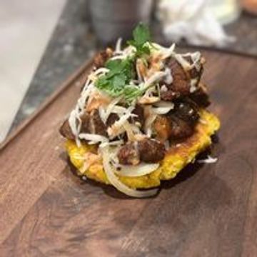 Handmade Arepa (sweet corn and yuca patty) topped with choice of chicken or pork (pictured)