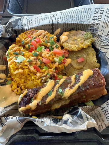 Yellow spanish rice served with choice of blackened chicken or pork belly. Comes with chefs choice of tostones or sweet plantains